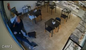 Un delincuente intentó robar en una panadería a un cliente que estaba tomando un café y mirando su computadora manual. El propio cliente lo redujo y el empleado del comercio le tiro varias prepizzas por la cabeza.