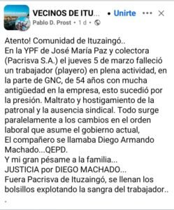 En un duro descargo, el usuario Pablo Prost denunció que el trágico desenlace de Machado estuvo estrechamente vinculado a las condiciones en las que desempeñaba sus tareas: “esto sucedió por la presión, el maltrato y el hostigamiento de la patronal, y la ausencia sindical”, reclamó en su cuenta de Facebook, enmarcando además la situación en “los cambios en el orden laboral que asume el gobierno actual”.