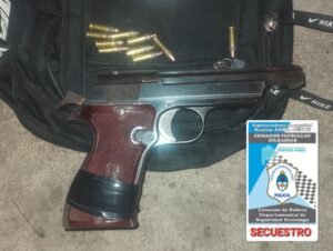 Los policías al requisar el vehículo hallaron un morral con una pistola calibre .22 cargada con 10 municiones. El arma de fuego tenía pedido de secuestro desde 2009 por un hurto en el partido de Vicente López.